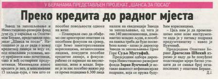 Zavod za zapošljavanje i Investiciono-razvojni fond juče su, u saradnji sa Opštinom Berane, predstavili projekat “Šansa za posao. Naglašeno je da se radi o novoj kreditnoj liniji za koju se, pod povoljnim uslovima, mogu prijaviti kako početnici, tako i već ostvareni preduzetnici. Minimalni iznos kredita je pet, a maksimalni 15 hiljada eura, s tim što se posebne povoljnosti odnose na žene.