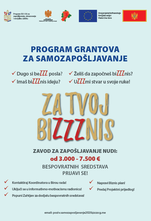 Zavod za zapošljavanje Crne Gore realizuje 3,5 miliona eura vrijedan projekat “Program grantova za samozapošljavanje”, koji se finansira iz pretpristupnih fondova EU.