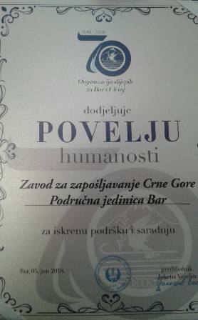 Zavod za zapošljavanje Crne Gore, Područna jedinica Bar, dobitnik je povelje humanosti Organizacije slijepih za Bar I Ulcinj. Na svečanoj akademiji, povodom obilježavanja 70 godina postojanja Organizacije, plaketu je primio šef Biroa rada Bar Željko Rolović.