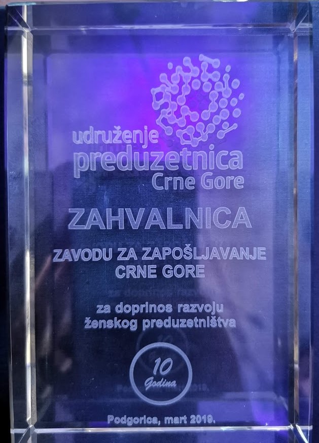 Zavod za zapošljavanje Crne Gore dobitnik je zahvalnice za doprinos razvoju ženskog preduzetništva u Crnoj Gori kroz projekte “Znanjem i edukacijom do posla”, “Nova znanja, nove šanse”, “Vjerujem da mogu”, aktivna politika zapošljavanja lica sa invaliditetom i teže zapošljive kategorije žena. Na svečanosti Udruženja preduzetnica Crne Gore, povodom 10 godina ženskog preduzetništva, plaketu je primila načelnica Sektora za finansije u Zavodu mr Svetlana Krgović.